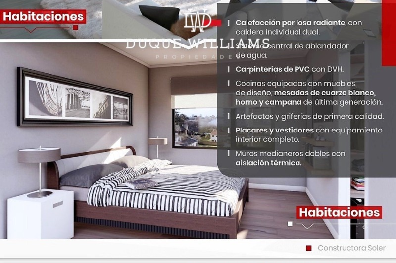 Cocinas equipadas con muebles de diseño, mesadas de cuarzo blanco, horno y campana de última generación.