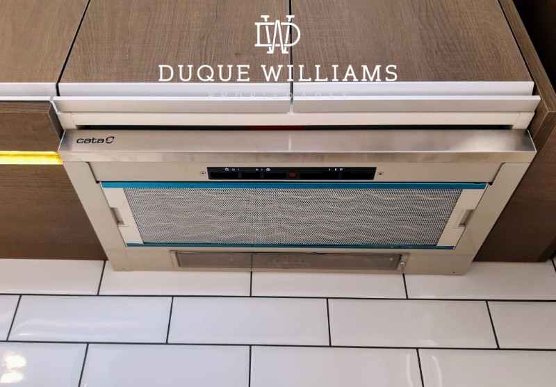 Cocina semi integrada con barra, con muebles a medida en melamina, horno y anafe eléctricos, extractor con salida al exterior, espacio para lavarropas